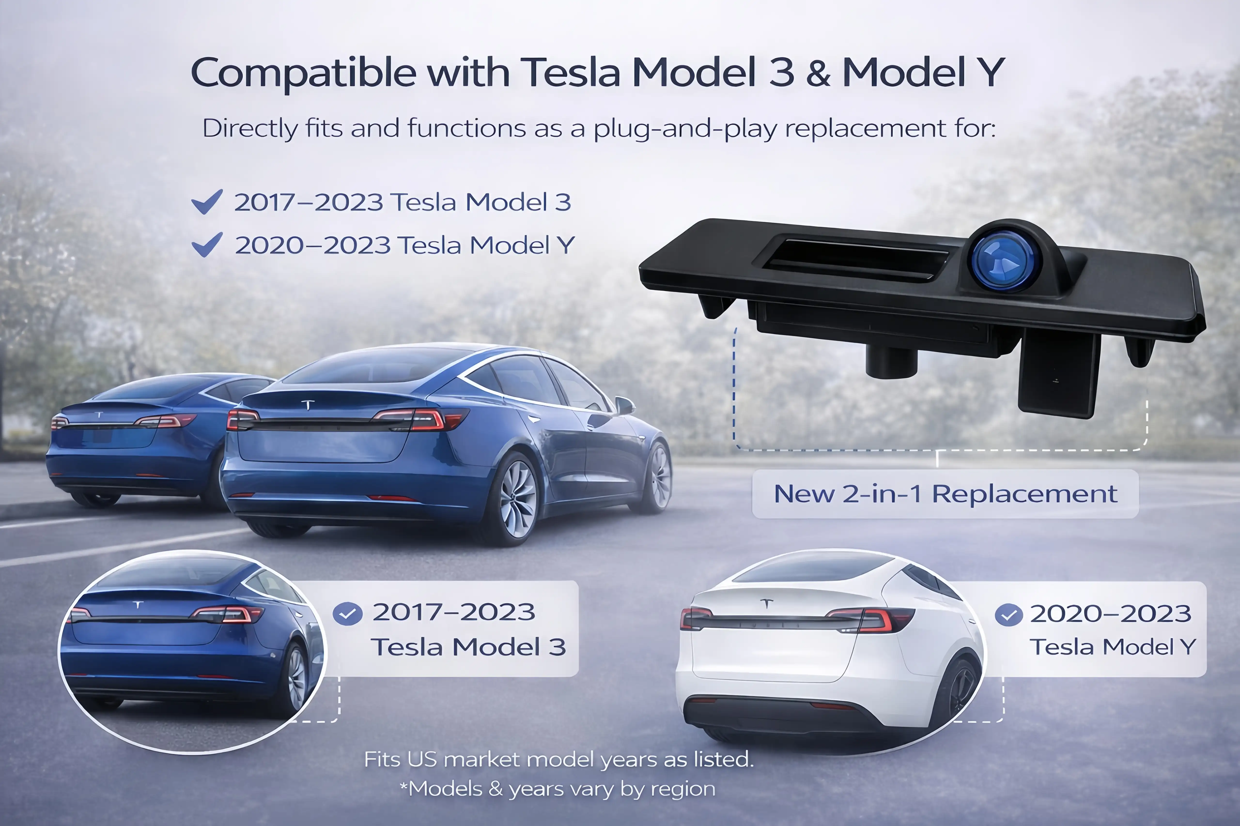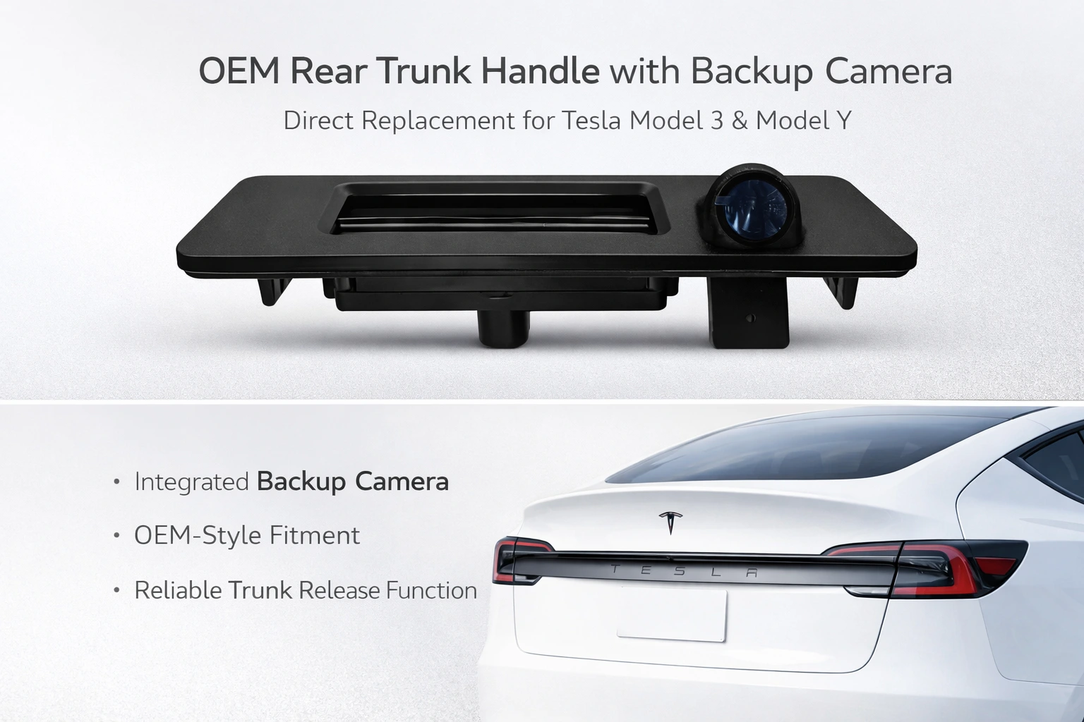 If your Tesla’s trunk release has become unresponsive, the rear camera image is blurry, or the original handle assembly is worn out, this replacement unit helps restore both functions in one install. Designed as an aftermarket replacement for OEM reference 1095949-00-E, it combines the rear trunk handle and backup camera into one direct-fit assembly for compatible Tesla Model 3 and Model Y vehicles.