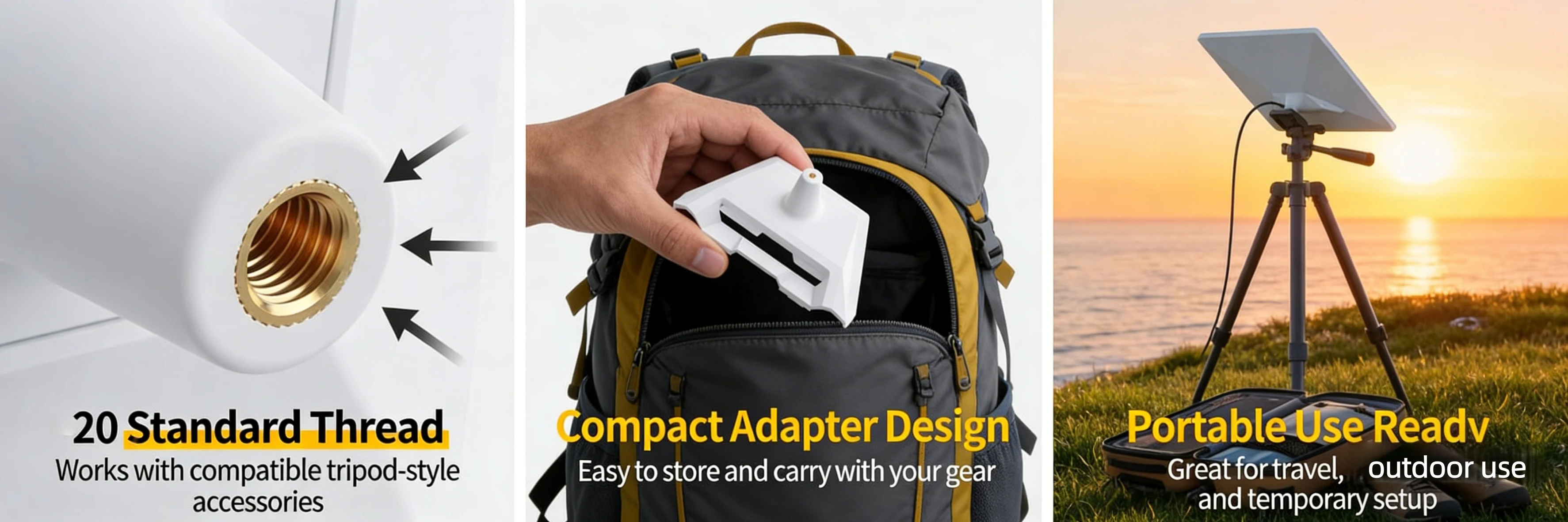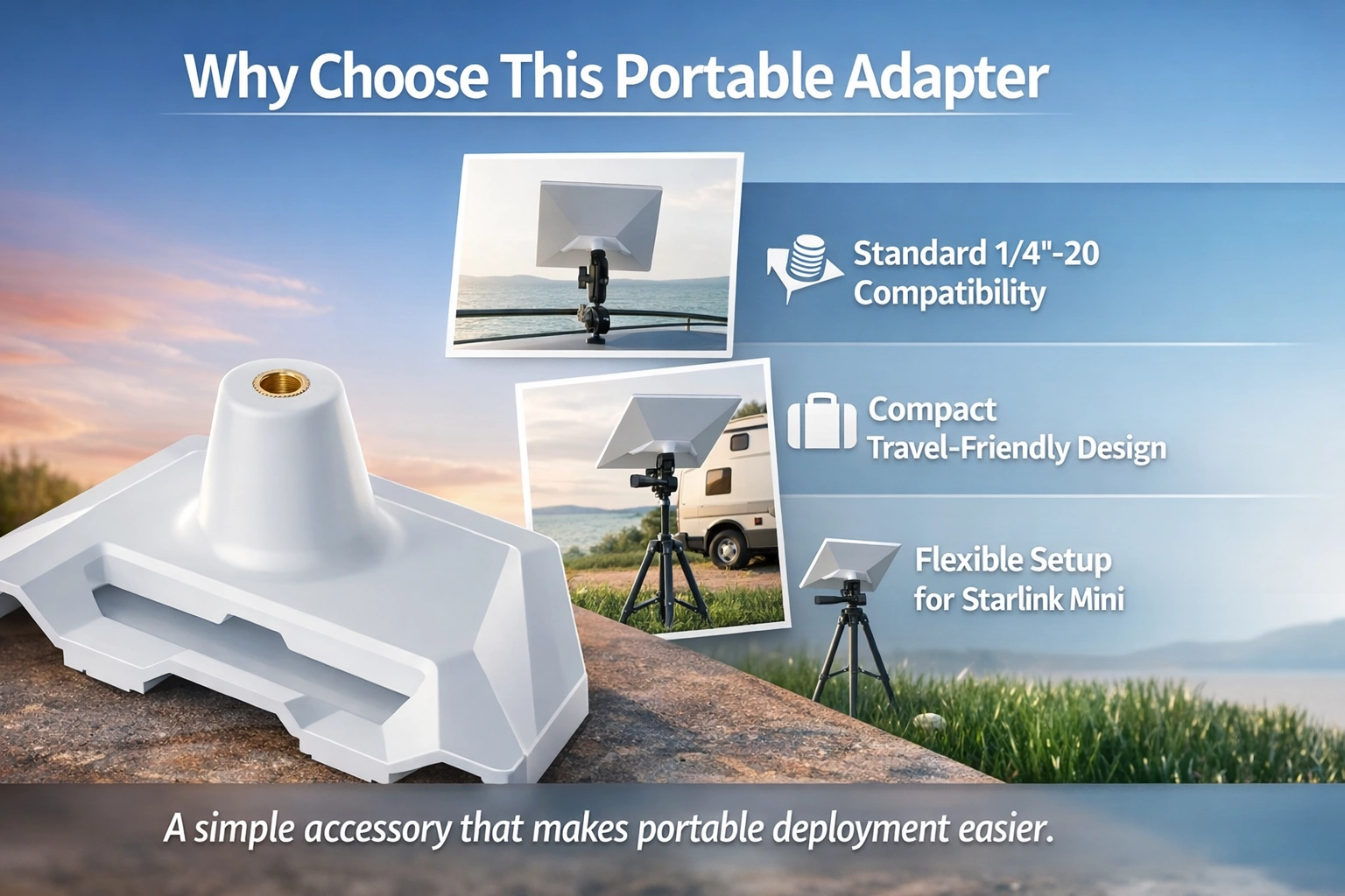 This Starlink Mini tripod adapter adds a standard 1/4"-20 threaded mounting option for more flexible portable setup. Ideal for camping, RV travel, temporary outdoor deployment, and backyard testing, it helps expand how and where you position your Mini for convenient on-the-go use.