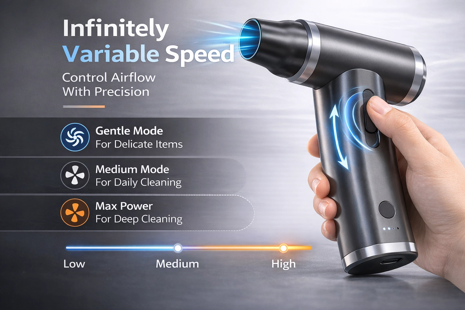 • Infinitely Variable Speed Control – Stepless speed adjustment button lets you control air volume precisely for delicate surfaces or heavy-duty cleaning.