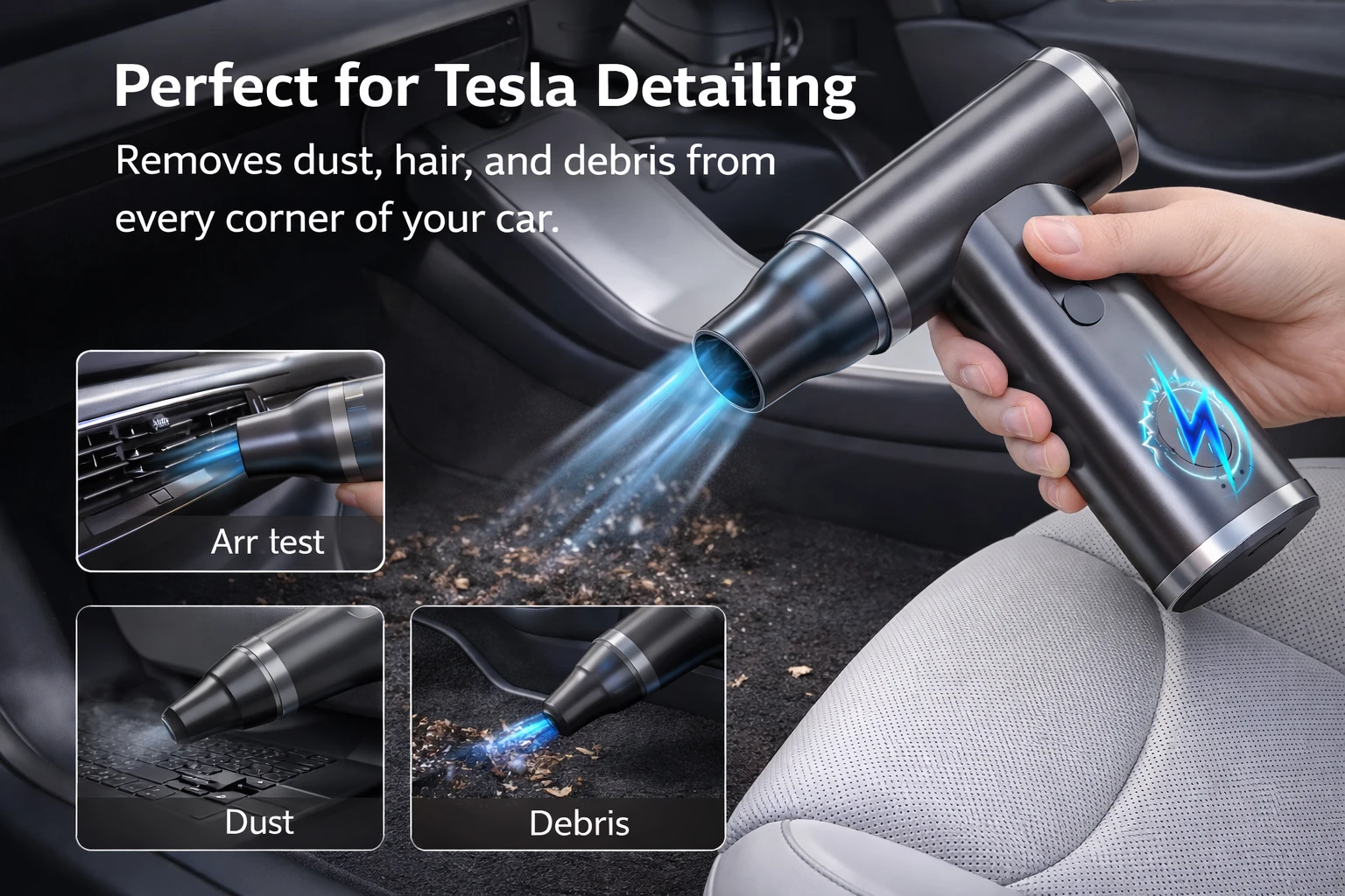 Upgrade your Tesla cleaning with our 125000RPM handheld wireless vacuum for Model 3/Y/X/S. Brushless aerospace alloy motor delivers extreme suction and airflow to remove hair, dust, and sand from cars, sofas, and keyboards. Stepless speed control and 5 versatile nozzles handle cleaning, inflating, and more. Lightweight, portable, and rechargeable with Type-C, offering 1–3 hours runtime. Perfect for car detailing, home use, and multi-purpose cleaning anytime, anywhere.