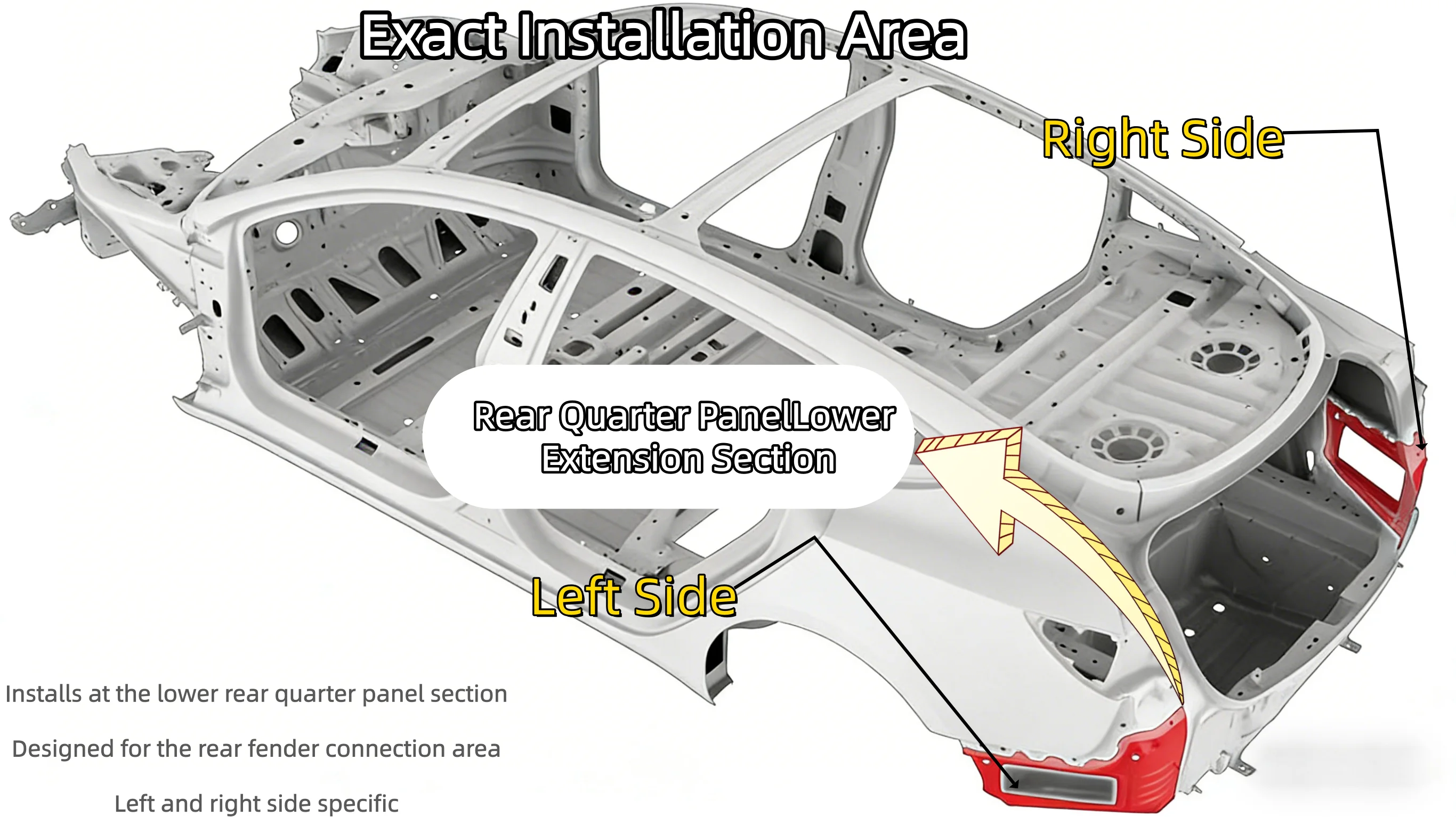 Location Rear quarter panel lower extension, rear fender connection area