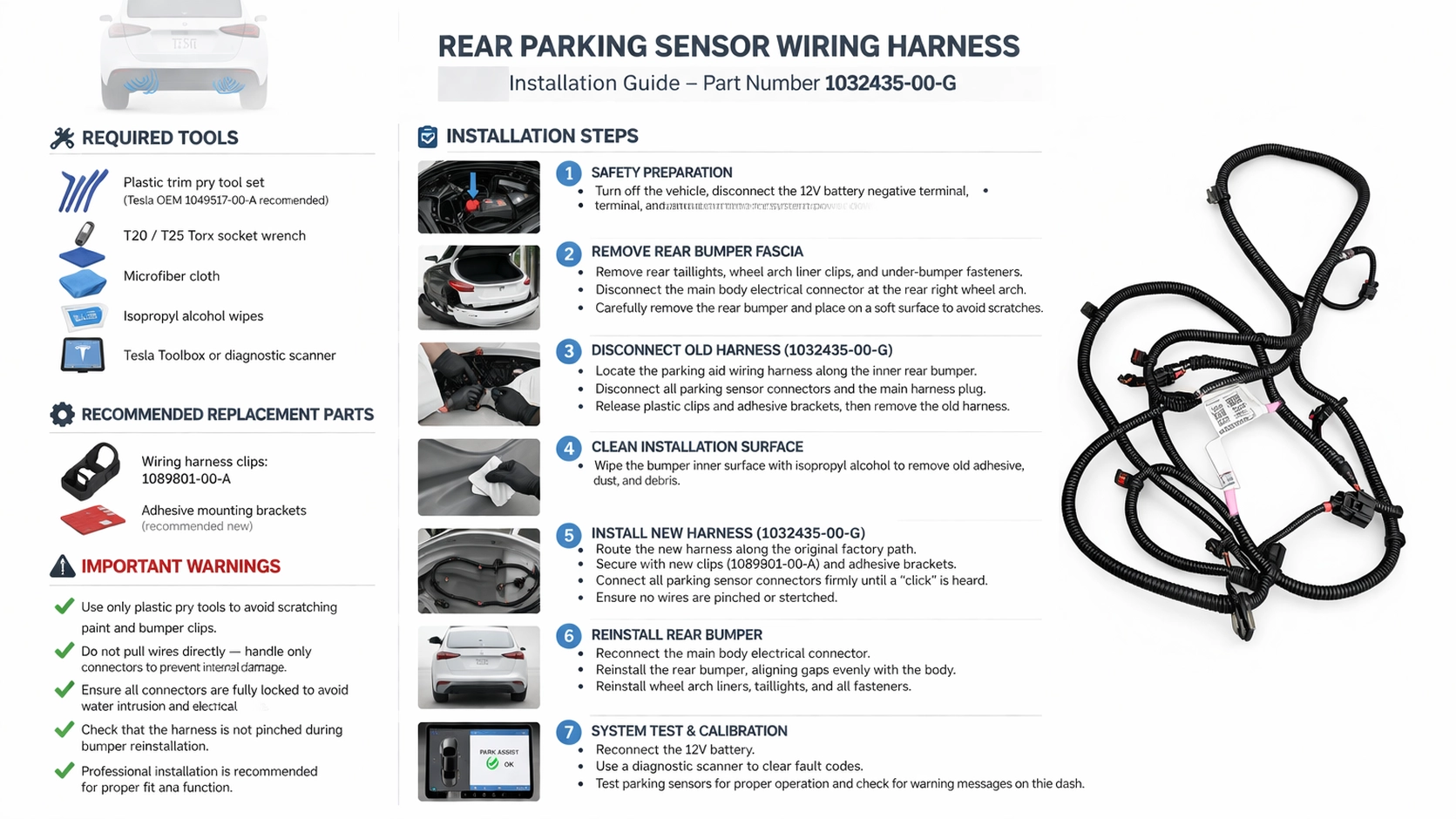 How This Product HelpsThis replacement harness is designed to restore the original rear sensor connection path behind the rear fascia. It can be a better repair option than patching damaged wiring sections and is especially useful during bumper repair, harness replacement, or rear parking assist system service. Matching the Tesla Model X 2016–2020 application together with OEM part number 1032435-00-G helps buyers confirm the correct fitment before ordering.Fitment VerificationCompatible Model: Tesla Model X