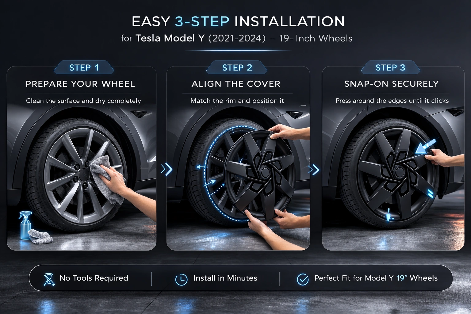 Enhance your Tesla Model Y (2021-2024) with these 19-inch full-edge wheel covers. Designed for DIY enthusiasts, these covers provide visual appeal and practical protection.