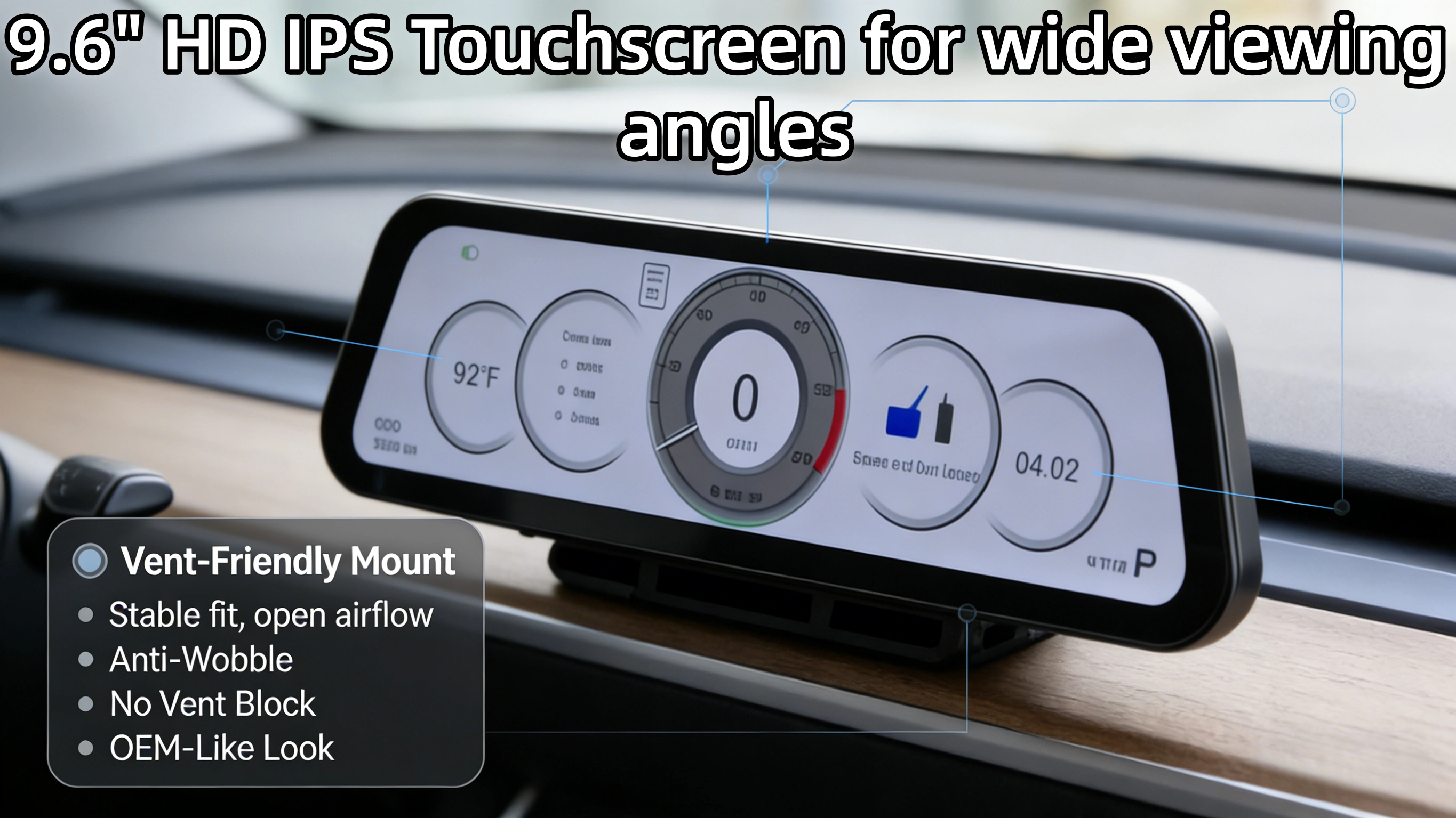 • Vent-Friendly Mounting: Model-specific brackets are designed not to block A/C airflow.