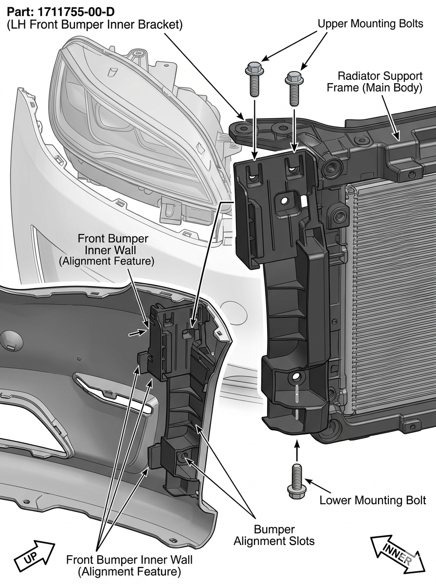 • Install: Align the new bracket (1711755-00-D) with the positioning holes. Hand-tighten the bolts first to avoid cross-threading, then secure them.