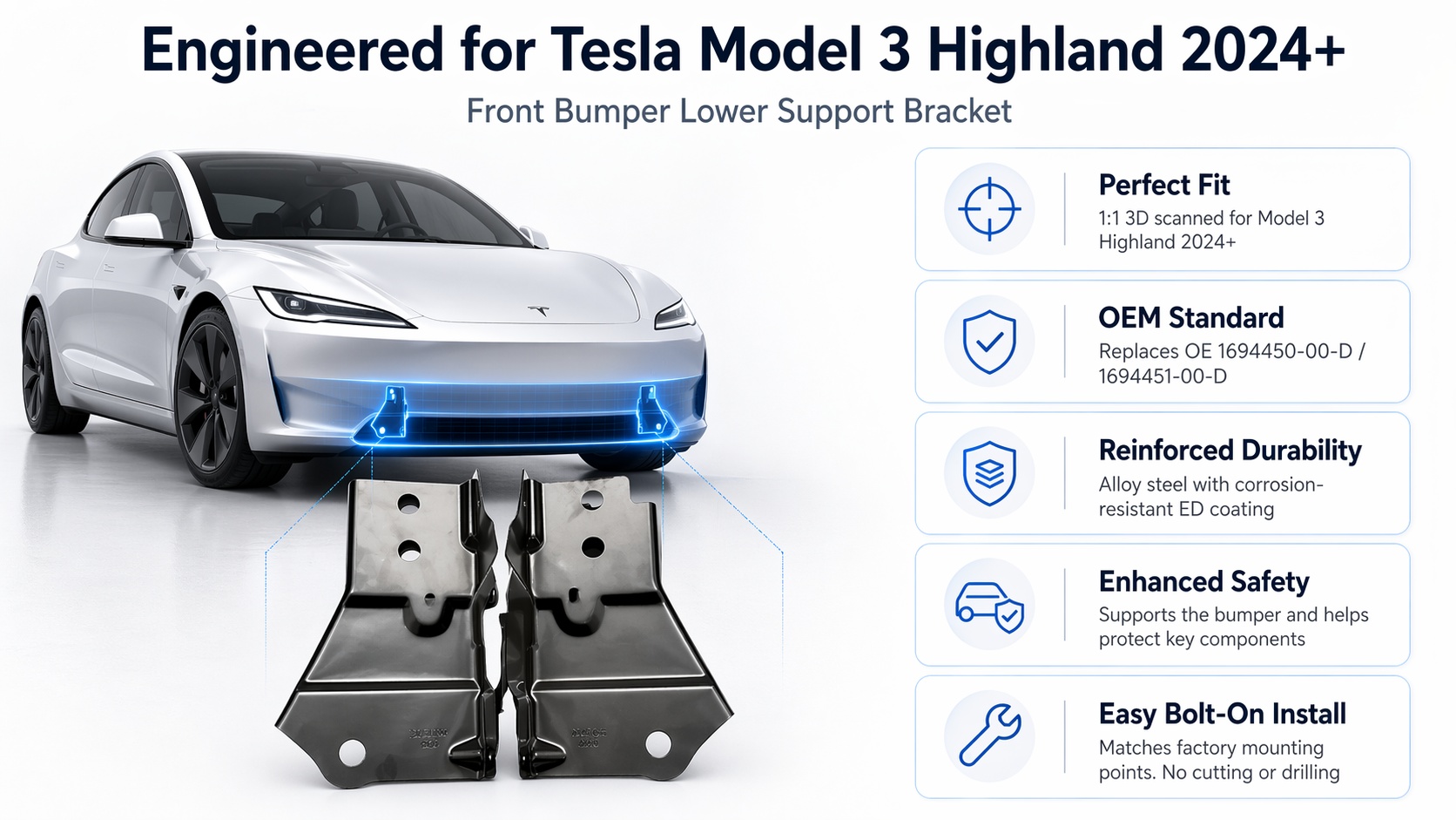 Built for Tesla Model 3 Highland 2024+, this front bumper lower support bracket is a factory-style replacement for damaged or missing original brackets. Available in left and right side versions and matched to OE references 1694450-00-D and 1694451-00-D, it helps restore proper front bumper support and repair alignment with more confidence.