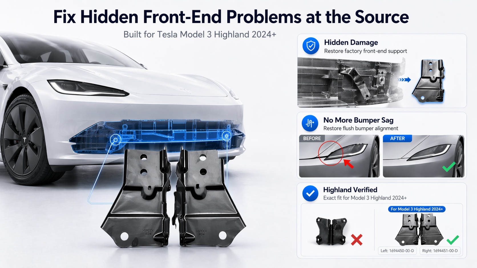 Solution 1: Factory-Spec Structural Integrity. Our heavy-duty replacement brackets restore your Tesla’s front-end rigidity to its original factory state, ensuring long-term durability and safety.