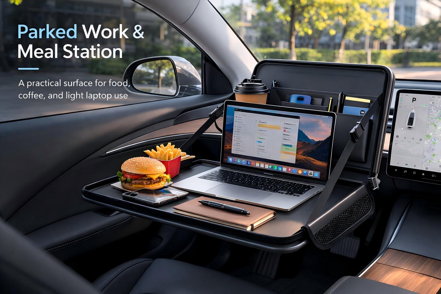 Whether you’re killing time at a Supercharger, waiting for a meeting, or on a family road trip, this multi-functional tray is the ultimate cabin upgrade. It seamlessly transitions from a professional workstation to a convenient dining table, keeping your Tesla interior clutter-free and sophisticated.