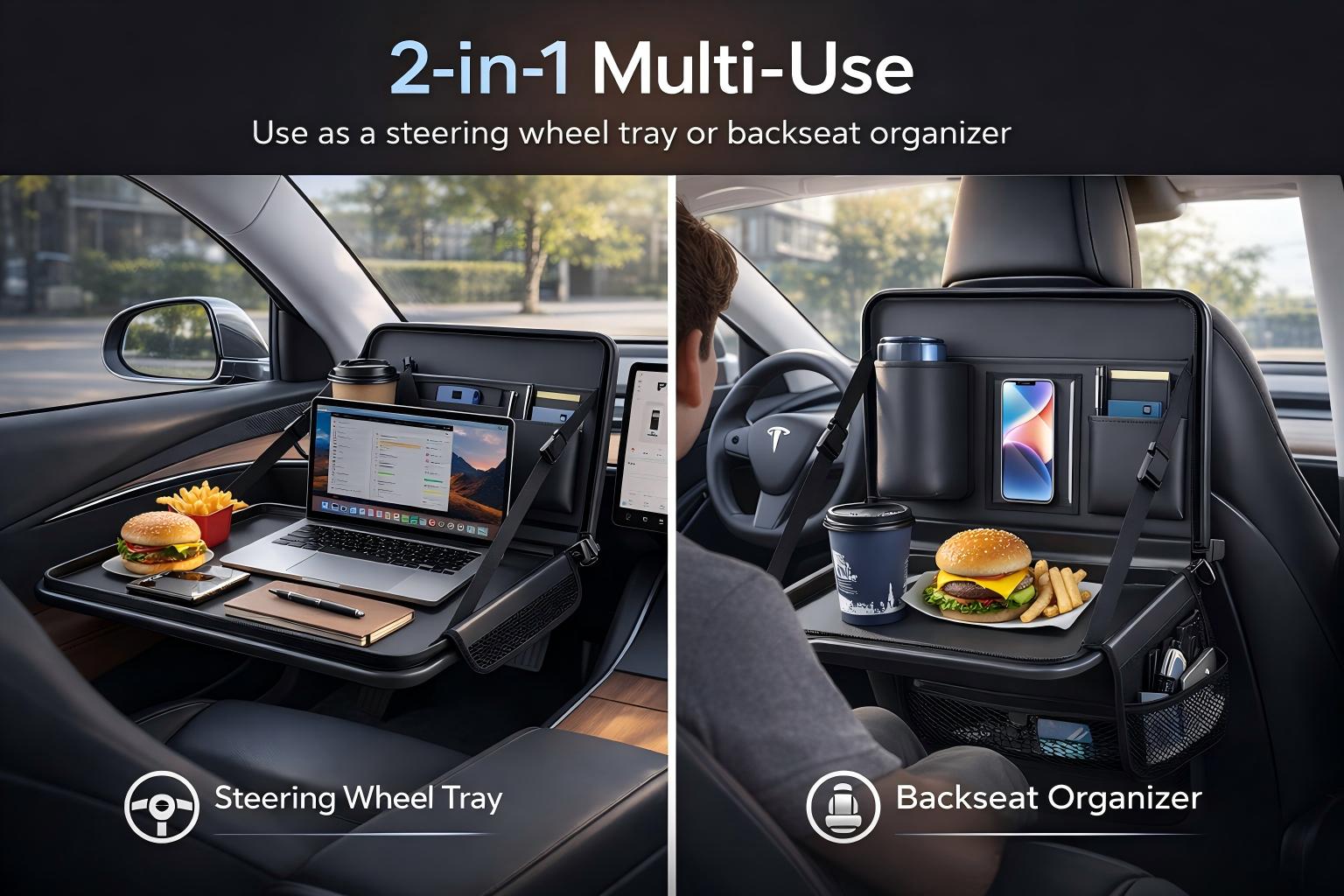 Tesla 2-in-1 Foldable Steering Wheel & Backseat Tray Organizer | Multi-Use Car Table
