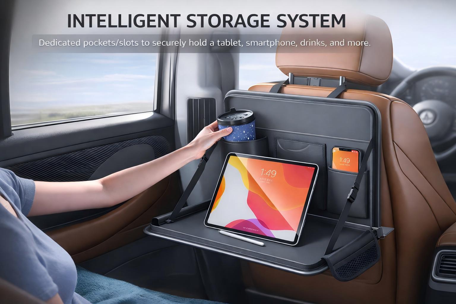 Smart Storage System: Dedicated pockets for your tablet, smartphone, tissues, and drinks. No more sliding items during your drive.