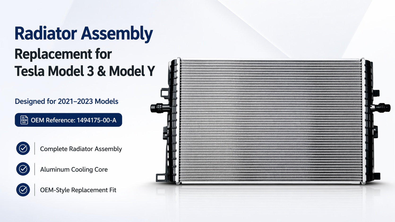 If your original radiator is leaking, damaged, clogged, or no longer in proper condition, this cooling radiator assembly provides a practical replacement solution for Tesla Model 3 and Model Y 2021-2023 applications. Built around OE reference 1494175-00-A, it is designed to match the original replacement logic more closely and help reduce fitment uncertainty before purchase.