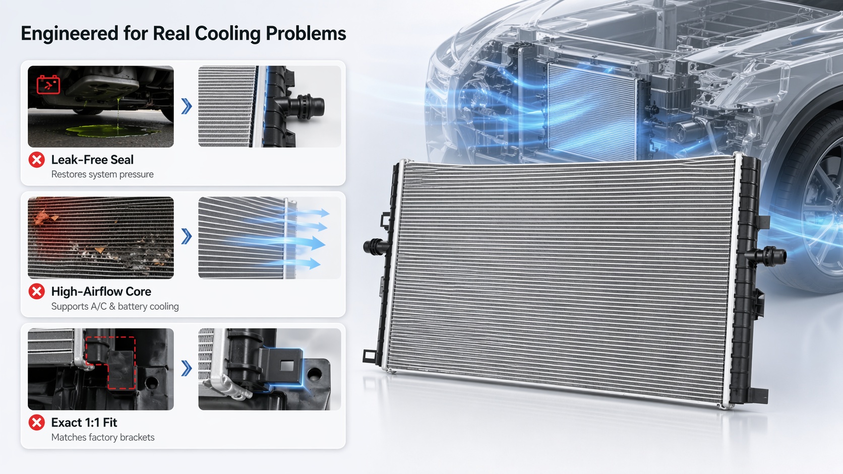 A practical replacement solution for a damaged, leaking, clogged, or worn original radiator assembly.