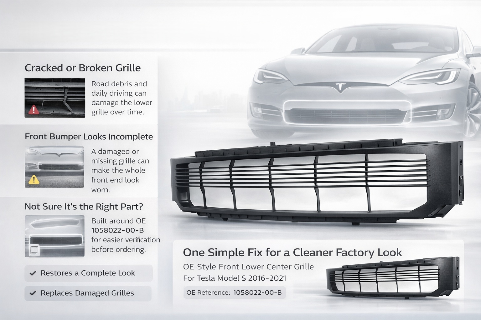 Front Lower Bumper Center Grille for Tesla Model S (2016–2021 Facelift) | Replaces 1058022-00-B