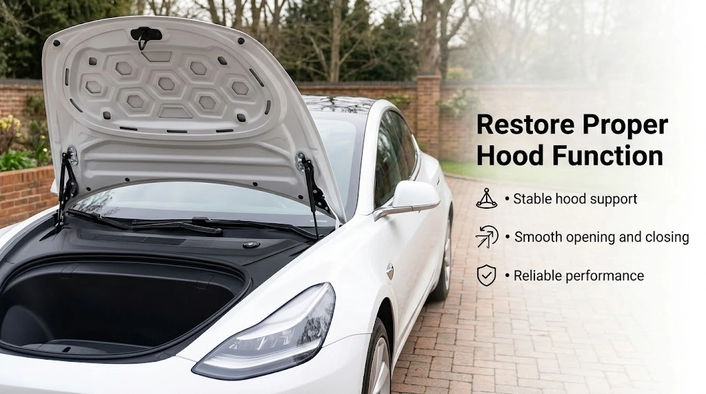 • Perfect Fit: Engineered to fit Tesla Model 3 2017–2023 models precisely, ensuring easy installation and smooth hood operation.